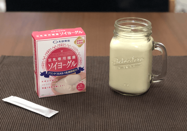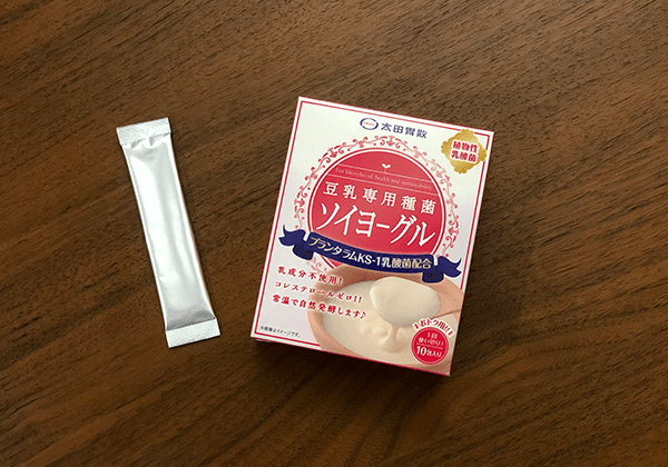 太田胃散の「ソイヨーグル」という商品なのですが、豆乳と混ぜて常温で放置しておくだけで、おいしい豆乳ヨーグルトが出来てしまうというスグレモノ。